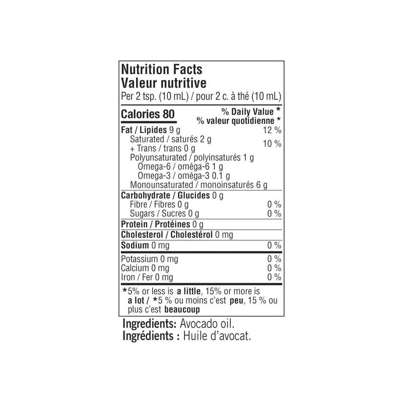 100% pure avocado oil; Light flavour; Smoke point at 240°C; For frying, grilling, and salads; 2 L