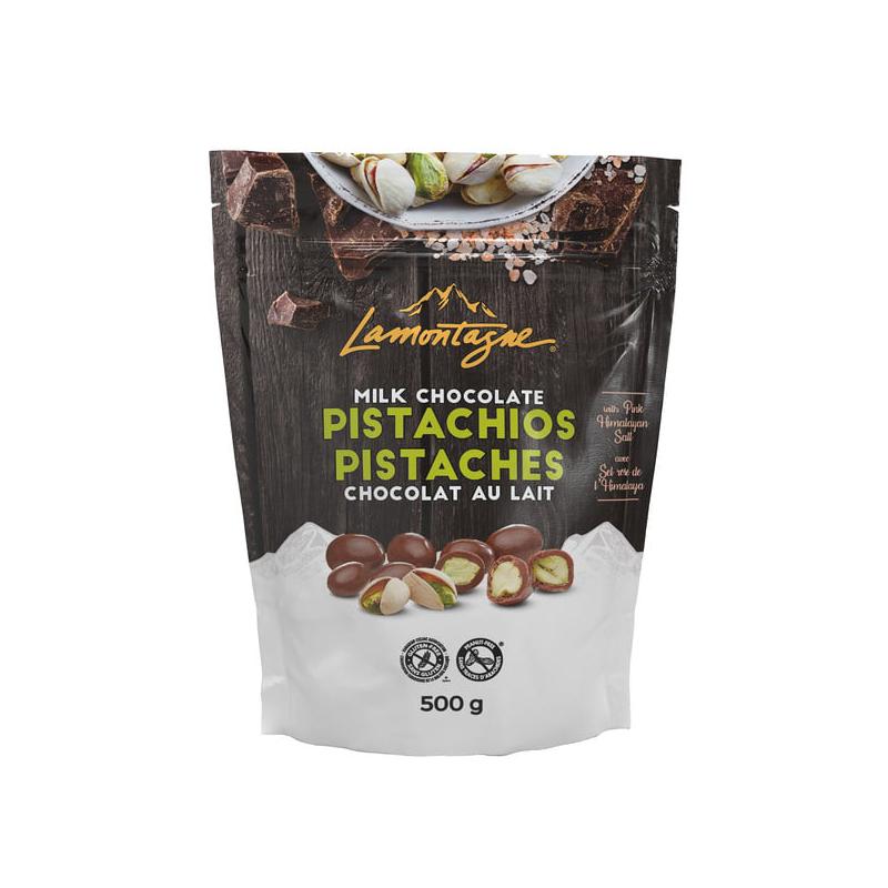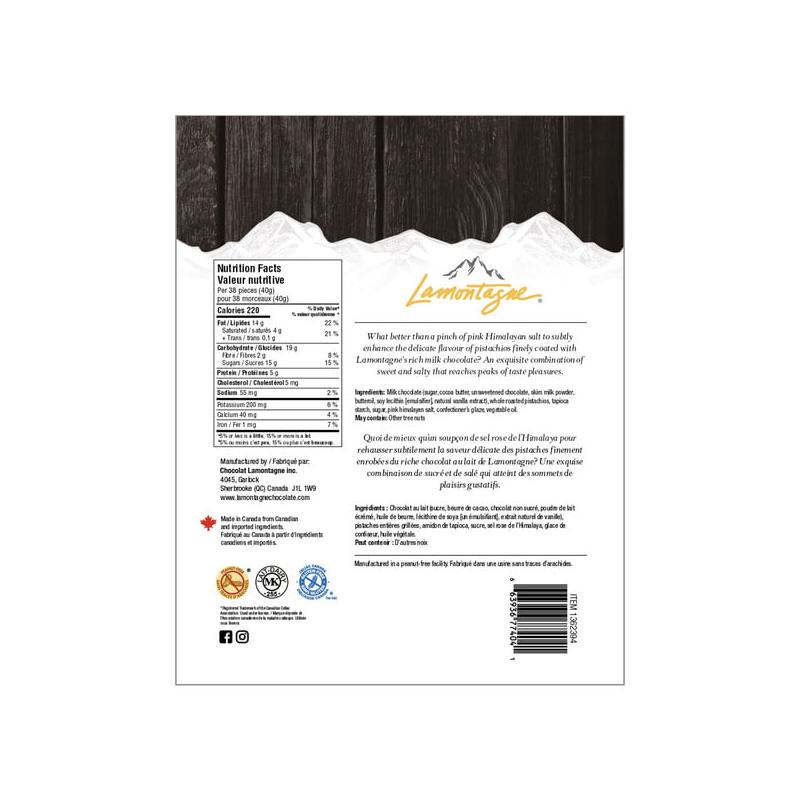 Chocolat au lait (sucre, beurre de cacao, chocolat non sucré, lait écrémé en poudre, huile de beurre [lait], lécithine de soya [émulsifiant], extrait naturel de vanille), pistaches entières grillées, eau, sirop de maïs, sucre, gomme arabique, sorbate de potassium [agent de conservation], acide citrique, sel de mer, glaçage de confiserie, huile végétale.