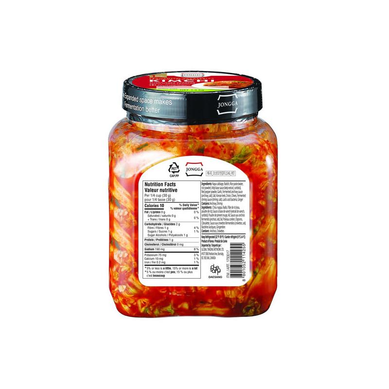Chou chinois, radis, pâte de riz (eau, poudre de riz), sauce de base Kep (extrait de repe, sorbitol), poudre de piment rouge, ail, sauce aux anchois fermentés (anchois, sel), sel, poireau coréen, orion, piment, sauce aux crevettes fermentées (anchois, sel), bactéries lactiques, gingembre
